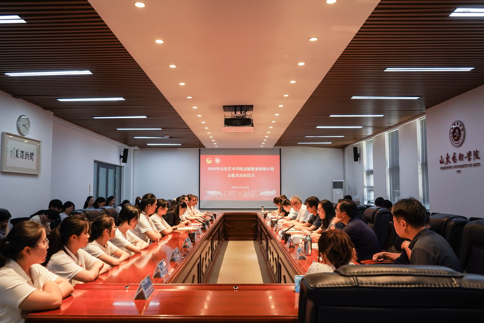 6月18日,学校在长清校区第一会议室举行2025年西部计划志愿者出征仪式。党委委员、副院长苏茂兴,党委委员、组织部部长孔亮,党委委员、宣传部部长孔宪坤,学生工作部(处)、团委、教务处、研究生处相关负责人,各二级学院党组织副书记、团总支负责人以及西部计划志愿者参加活动。