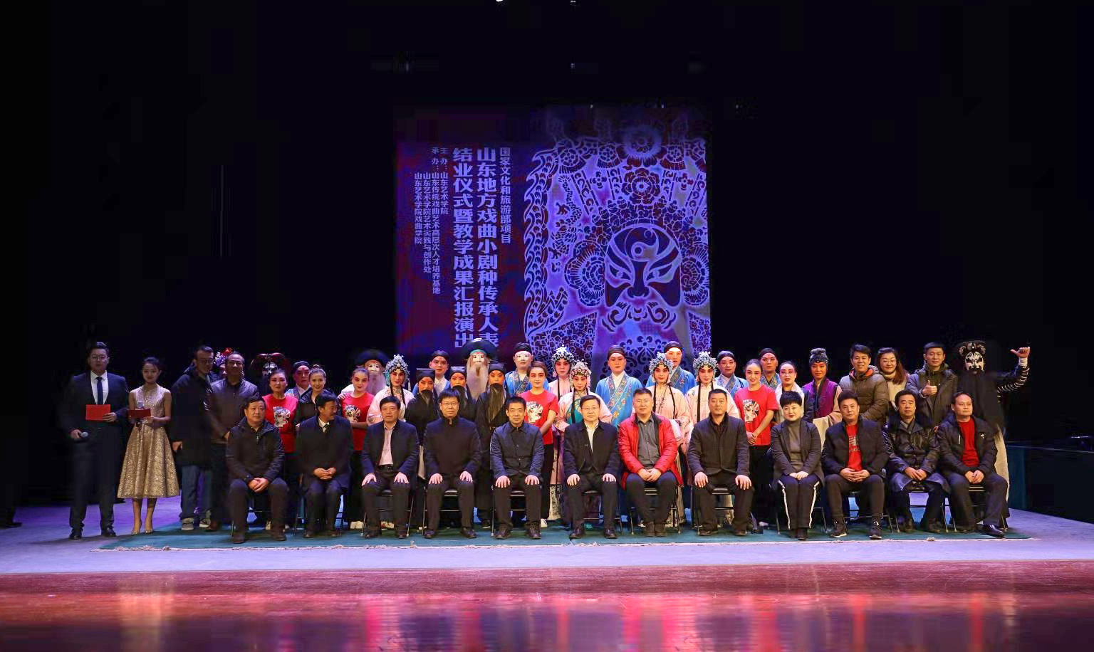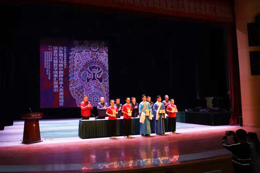 12月4日,中国非物质文化遗产传承人群研修研习培训计划·2019年山东省地方戏曲小剧种传承人表演培训班结业仪式暨教学成果汇报演出在山东艺术学院文东校区艺术剧场举行。山东省文化和旅游厅非遗处处长刘朋鑫,山东艺术学院副院长杨西国出席活动,各地方院团代表,学校艺术实践与创作处负责人及戏曲学院师生代表参加活动。结业仪式由戏曲学院院长王文清主持。