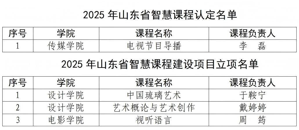 近日,山东省高等教育学会、山东省高等学校课程联盟公布了2025年山东省智慧课程认定结果。我校1门课程获评2025年山东省智慧课程,同期申报的3门课程获批2025年度山东省智慧课程建设项目立项。