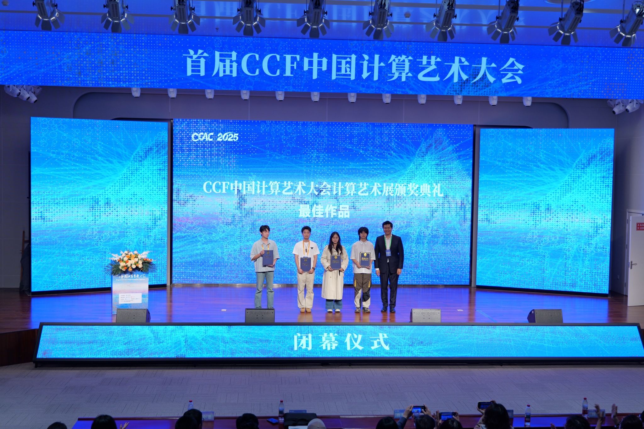 闭幕会上,大会执行主席、山东省音协主席、山东艺术学院音乐学院院长王歌群为《社会决策模拟器》《北极的眼泪》《清风徐来——数字人制作与应用》《神经微光》4部最佳作品获奖者颁奖。大会展览委员会主席魏冰、白小墨为《具身—辨人》等38件入围作品获奖者颁奖。