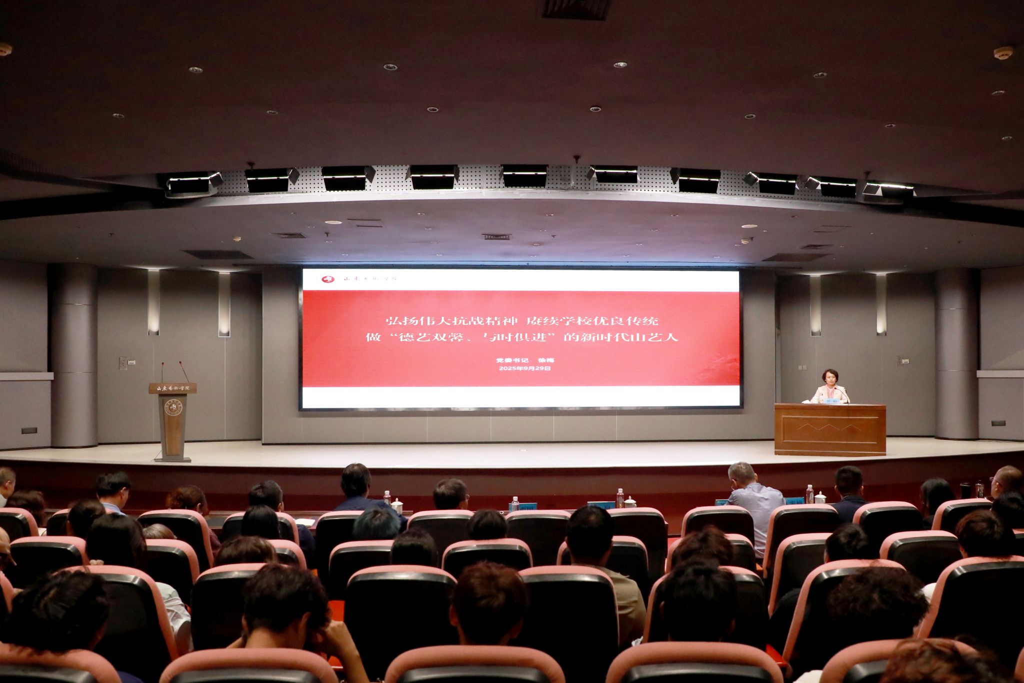 徐梅以《弘扬伟大抗战精神 赓续学校优良传统 做“德艺双馨、与时俱进”的新时代山艺人》为题,通过详实的数据对比、清晰的脉络分析、生动的视听展示,从学历史懂历史,弘扬伟大抗战精神,清醒认识过去;进山艺爱山艺,赓续学校优良传统,精准把握现在;想成才能成才,谱写精彩艺术人生,更好开创未来三方面,详细讲解了伟大抗战精神的深刻内涵、学校的深厚底蕴和优良传统以及对新生学习生活的建议等,为新生上了一堂生动的思政课。