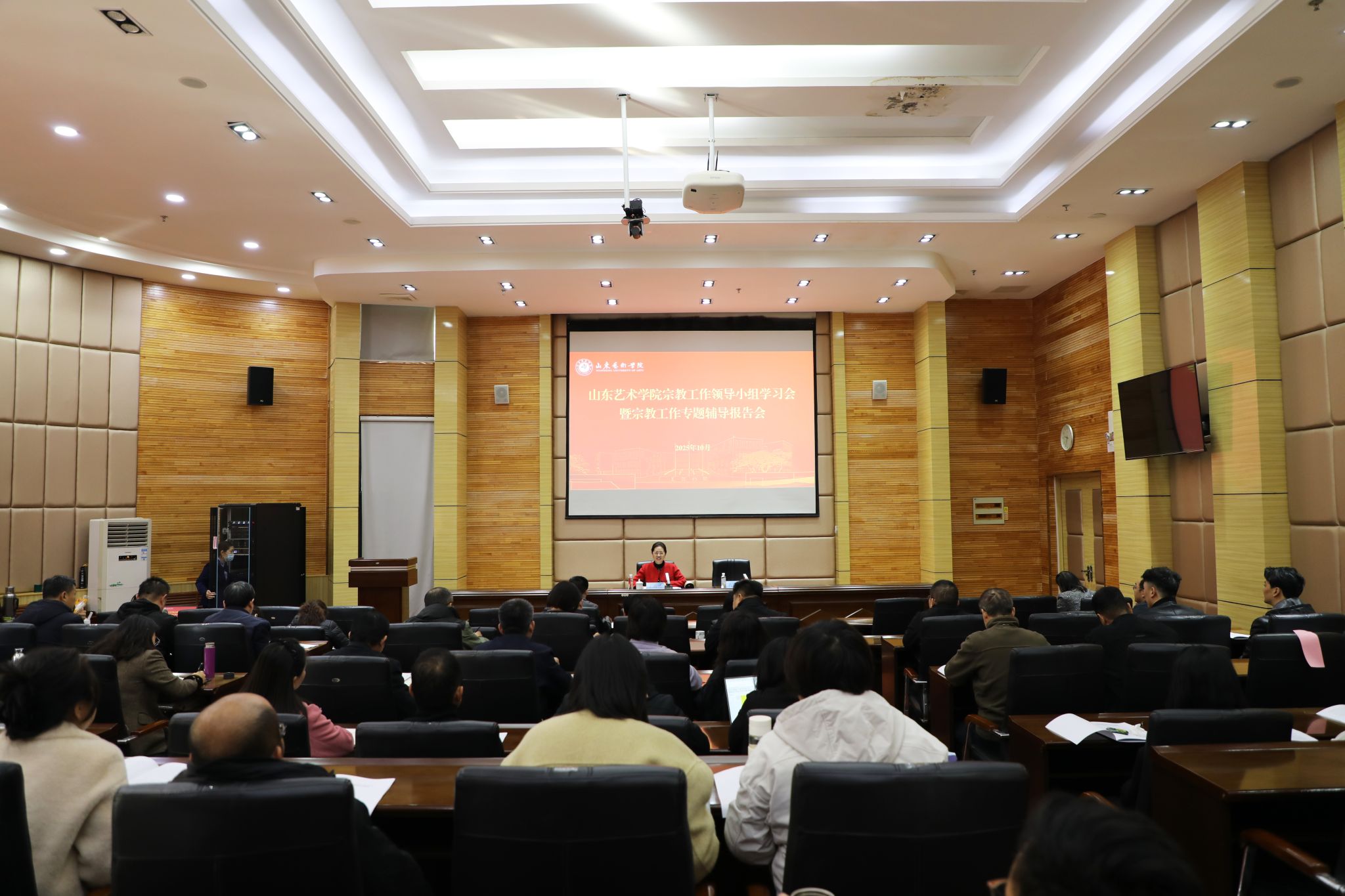 10月21日,学校在长清校区二楼报告厅举办宗教工作领导小组学习会暨宗教工作专题辅导报告会。省教育厅(省委教育工委)二级调研员王霄凌应邀作专题辅导报告。学校党委副书记、统战部部长杨西国与王霄凌进行了会面交流。报告会由党委委员、宣传部部长孔宪坤主持。