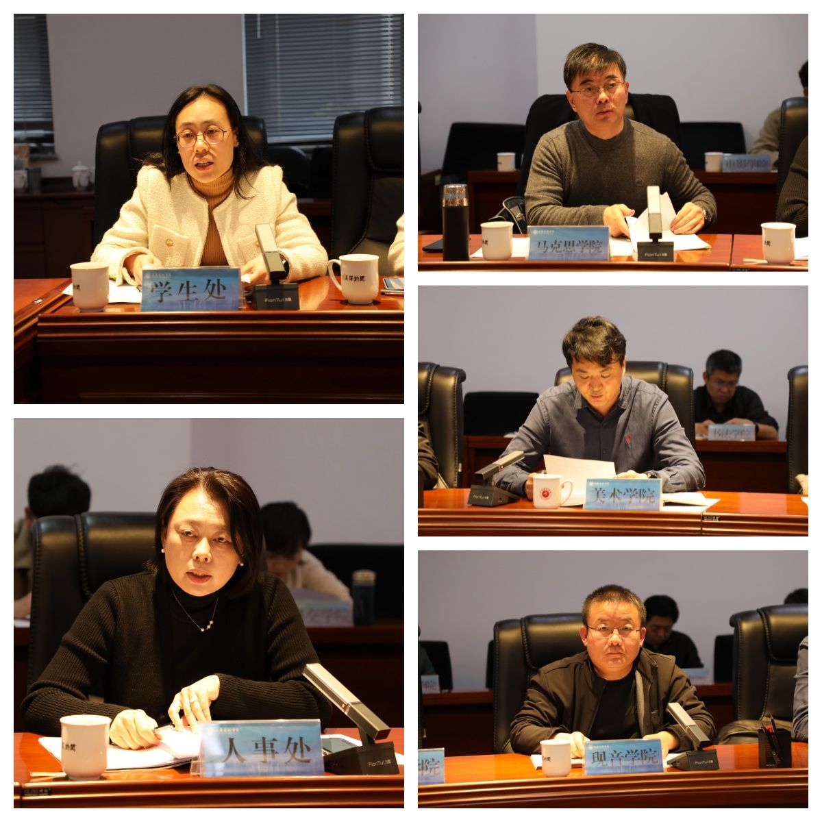 徐梅全面剖析了学校思政工作的成效与不足。她指出,要强化统筹规划,健全协同育人工作体系,思想政治工作领导小组要切实发挥牵头抓总、协调各方作用,定期召开专题会议,分析研判思政工作形势,研究解决重大问题。要深化理论武装,筑牢师生思想根基,把学习贯彻习近平新时代中国特色社会主义思想作为首要政治任务,持续深入学习宣传贯彻党的二十届四中全会精神,推动党的创新理论入脑入心、落地生根。要建强马院阵地,提升思政课程建设质量,严格落实新修订的《山东艺术学院加强马克思主义学院建设实施方案》,深化思政课改革创新,推行艺术融入思政课教学模式,探索思政课程与课程思政同向同行、协同育人的新路径。要推动思政课教师和辅导员两支队伍同向发力、协同赋能,以“双轮驱动”夯实立德树人根基。要创新育人载体,增强思政工作实效,通过持续深化网络思政建设、组织师生开展主题性艺术创作、加强校园文化建设等方式,实现春风化雨、润物无声的育人效果。