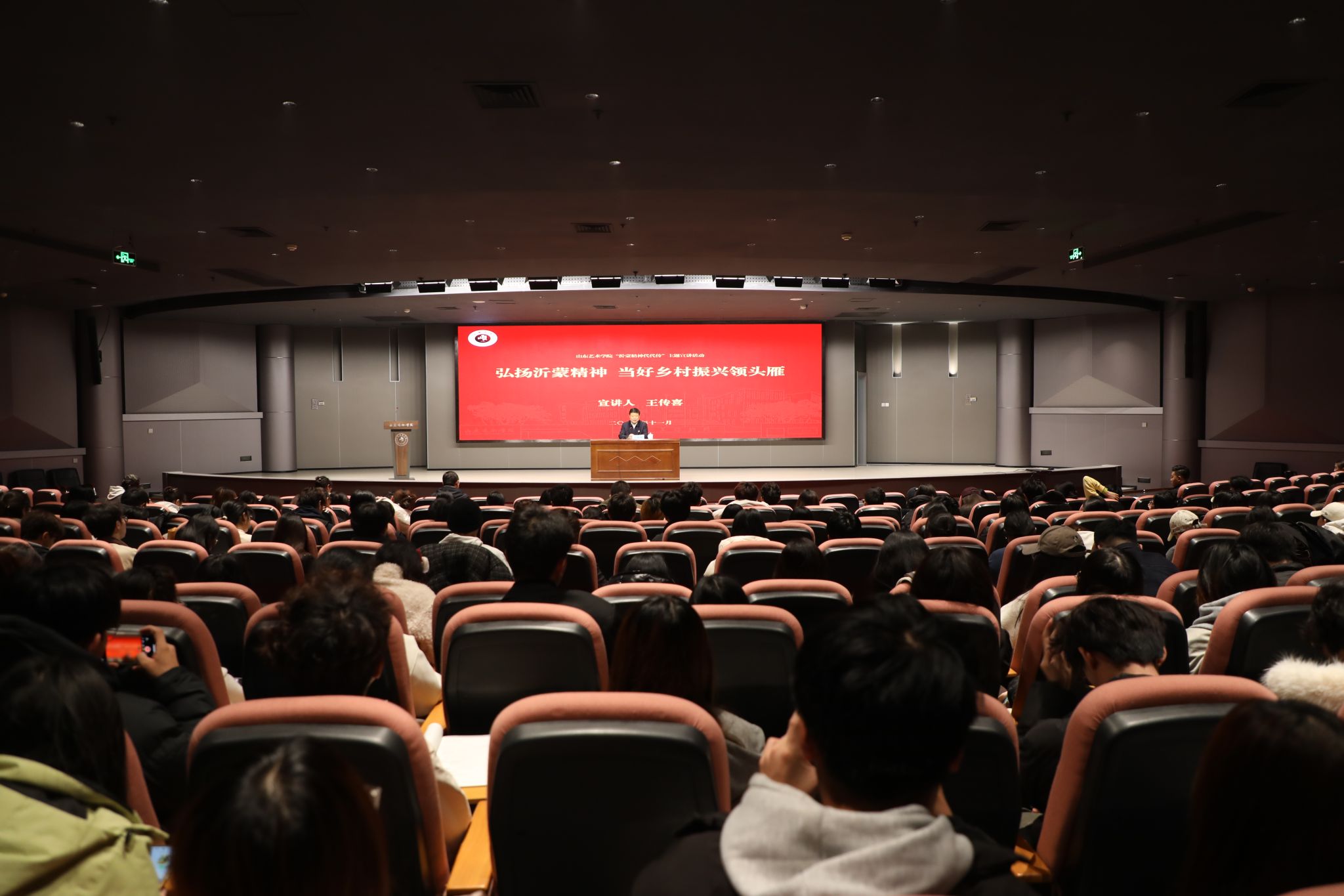 与会师生观看了《和美代村,沂蒙江南》宣传片,共同体会脱贫攻坚和乡村振兴对人民生活带来的巨大变化。王传喜围绕乡村振兴战略总要求、中国共产党发展历程诠释了“党群同心、军民情深,水乳交融、生死与共”沂蒙精神的内涵及发展。同时结合代村发展历程,从核心在旗帜引领、前提在头雁领航、关键在产权改革、底蕴在精神滋养、基础在依靠群众、美好在守正创新六个方面,讲述了他带领代村脱贫致富的奋斗故事。他强调,必须牢抓党建促发展,农村基层党组织书记作为“领头雁”,必须敢担当、善作为。