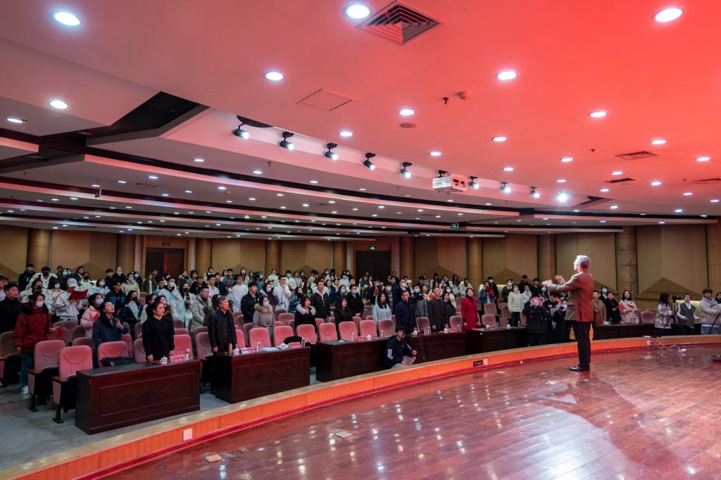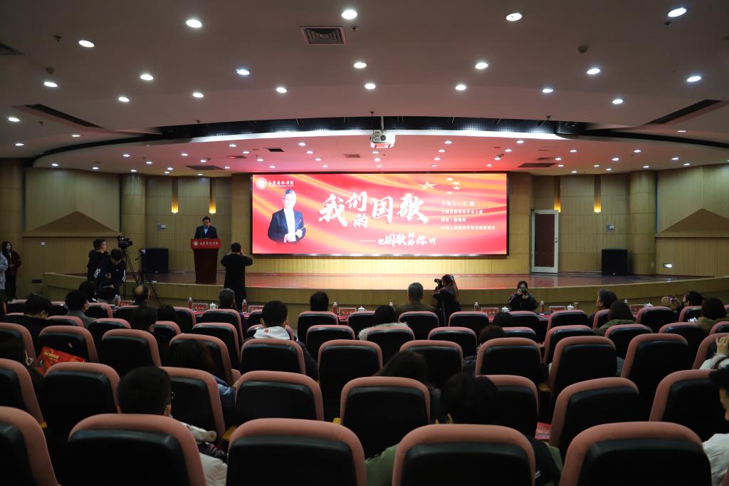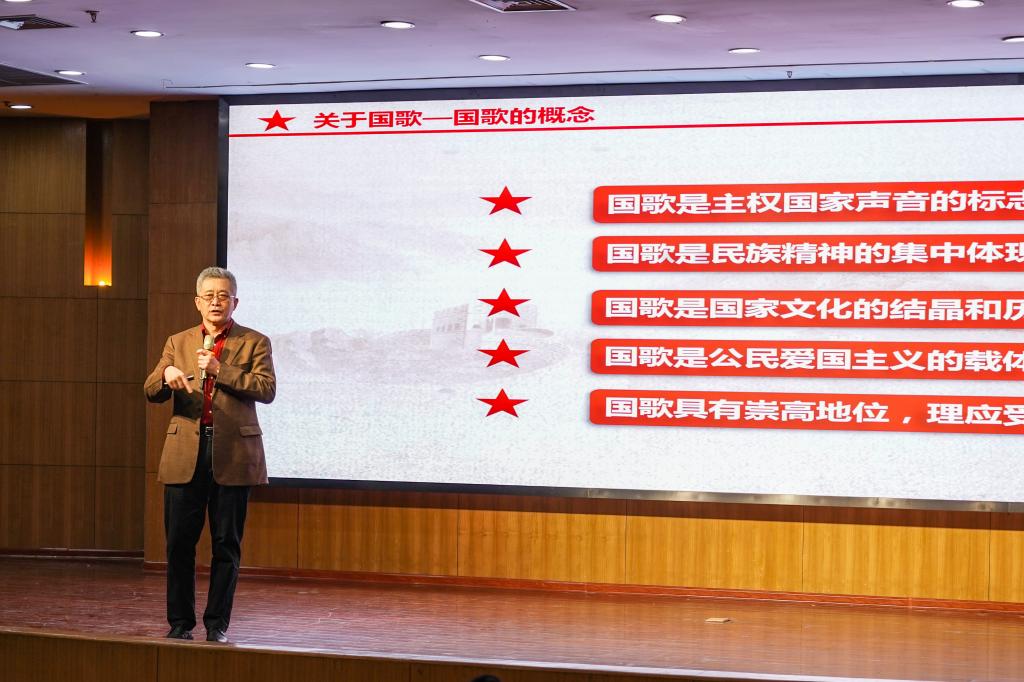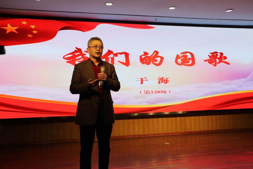 于海先生依次从“关于国歌”“中华人民共和国国歌的发展历程”“国歌是国家神圣的象征”“国歌是家国情怀的重要内容”和“我们的国歌是世界上最好的国歌”5个部分,为大家阐述了国歌之美及其重要性。“我们的国歌有84个字,37个小节,标准时长是46秒,这是每一个中国人都应该牢记的。”于海先生动情的说。围绕国歌产生的文化背景、历史渊源、地位意义等,他结合多年的实践经历,以叙事的视角生动地展开讲述。通过音乐播放与现场讲解相结合的方式,旁征博引地讲述了中外国歌的历史和典故,并通过分享《中华人民共和国国歌》(《义勇军进行曲》)创作历程和背后的故事,阐明了国歌所具有的崇高地位,展现了国歌作为国家声音的标志、民族精神的体现、国家文化的结晶和公民爱国主义载体的重要意义。他讲到,每一段国歌都有一段独特的故事,国歌也见证着那段光辉而艰难的民族岁月,国歌背后的一个个故事也蕴含着一个国家强大的力量。“《义勇军进行曲》体现了中华民族的光荣传统,产生了推动中国社会前进的巨大力量,它是各族人民共同的精神支柱。”报告会结束时,在于海先生的带领指挥下,全体师生起立,挥舞着国旗,情感饱满地唱响了激昂的《国歌》。