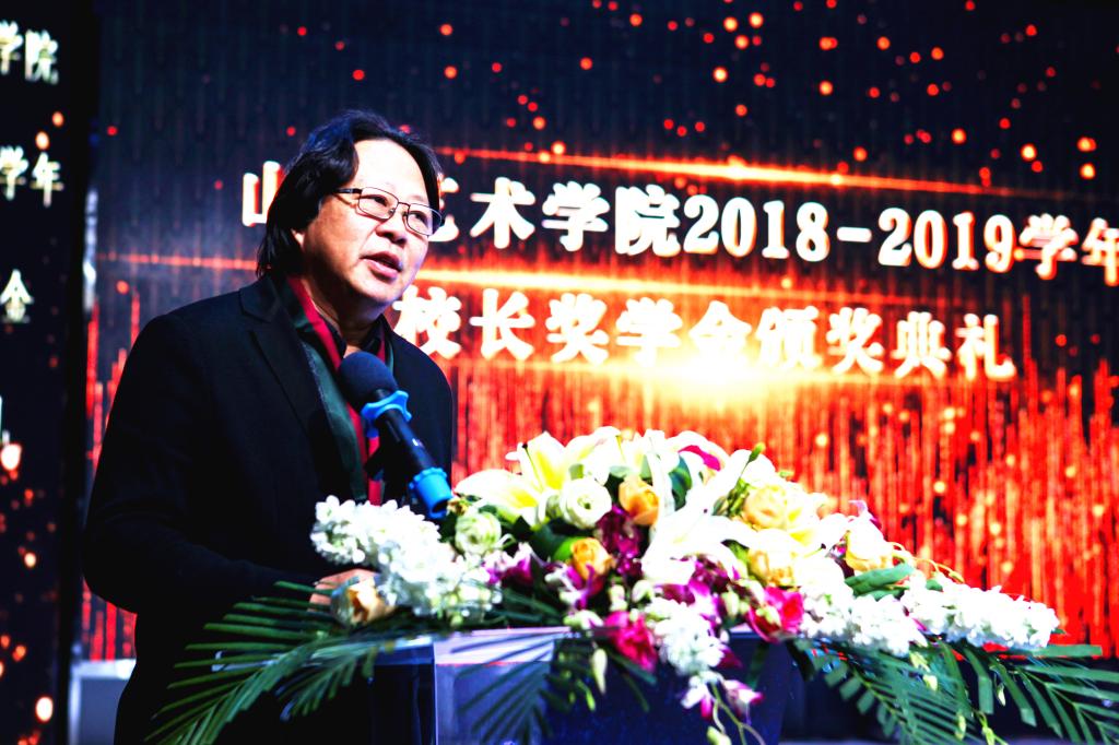 王力克为获奖学生一一颁发荣誉证书,与获奖学生合影留念并讲话。他首先代表学校向2018—2019学年校长奖学金获奖同学表示热烈祝贺。接着,他带领大家一起回顾了2019年学校各方面发生的变化、取得的成绩。他讲到,今天是2019年的最后一天,在这个特殊的日子里,回顾即将过去的一年,是山艺近四十年来成绩最突出、变化最大的一年,这是一代代山艺人砥砺奋进、长期积累的结果。一年来,学校各方面成果丰硕、成绩斐然。王力克如数家珍地列举了其中几项:学校成立了年画艺术研究中心,并被教育部认定为2019年全国普通高校中华优秀传统文化传承基地;成功承办第十二届中国音乐金钟奖全国声乐选拔赛,我校师生在下半年的决赛中取得优异成绩;博士学位授予单位申建工作取得阶段性成果;学校被确定为山东省十所重点高校之一;我校设计制作的国庆70周年山东彩车“国泰民安”精彩亮相天安门广场;成立了书法学院,奋力走在全国高等书法教育教学研究前列;电影艺术产学研基地在青岛西海岸新区开工奠基;成功主办第三届国际海洋油画学术高峰论坛、全国歌剧理论与创作研讨会暨首届优秀歌剧评论征集比赛等全国性重要会议活动;拍摄出品的电影《生死30分》在中央电视台电影频道播出并取得高收视率,广受关注和好评;改造提升了部分二级学院教学办公场所,建设教育教学中心,办学条件进一步改善,初具现代化大学面貌。这一年,山艺人精神面貌焕然一新,自信满满。2019年,必将在山艺迈向特色鲜明、国内一流的现代化高水平艺术大学的征途中,写下浓墨重彩的一笔。