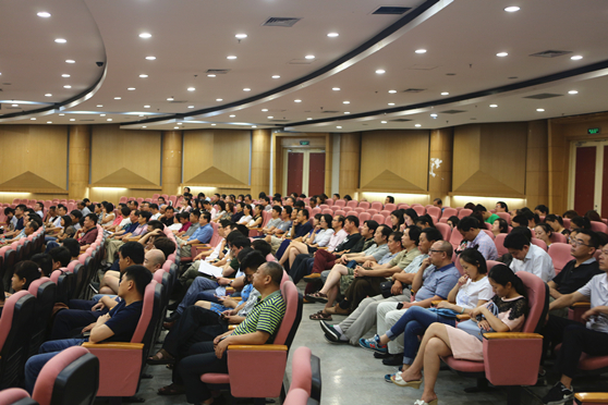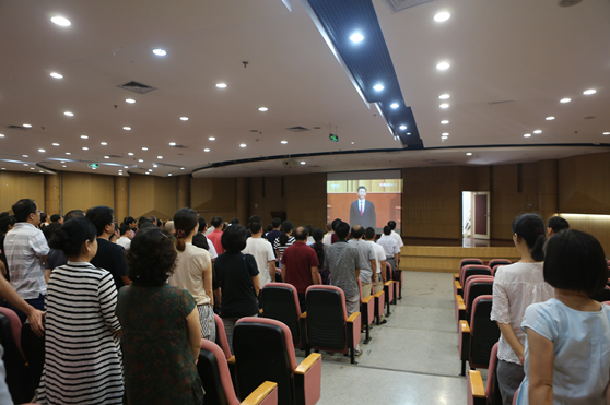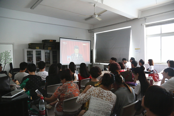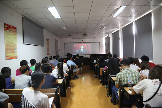 党员干部和师生在长清校区图书馆报告厅观看庆祝中国共产党成立95周年大会实况直播