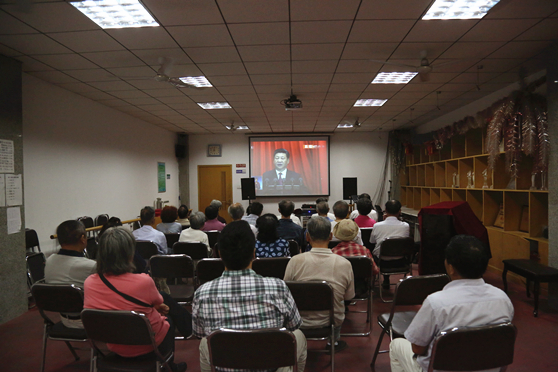 老党员们在文东校区老干部活动中心观看大会现场直播