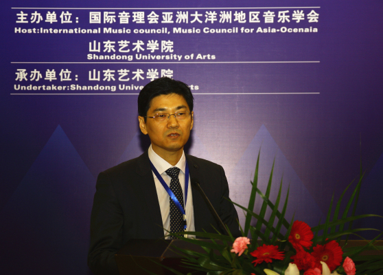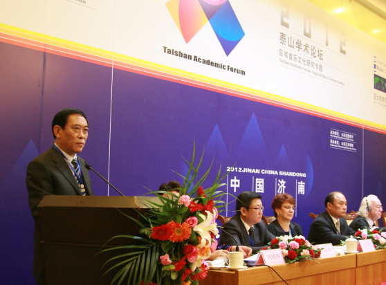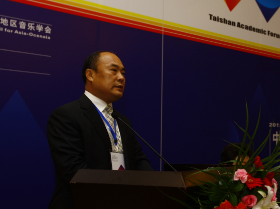 山东省教育厅副厅长张兴民在开幕式上致词。张兴民副厅长说,“泰山学术论坛”自设立以来,以“泰山学者”建设工程为主要依托,有力地促进了学科发展和青年教师创新能力的提高。山东艺术学院是山东省唯一一所综合性高等艺术学府,在省委、省政府的正确领导下,学校秉承改革创新的时代精神,解放思想,科学务实,办学水平、人才培养质量和服务社会的能力显著提高。山东艺术学院音乐学科是省级重点学科,也是音乐学和民族音乐学“泰山学者”设岗学科,拥有音乐文化研究省级重点研究基地。经过长期的建设与发展,学科在山东民族民间音乐研究、作曲技术理论和音乐创作、中国近现代音乐史料发掘与整理等研究领域有较大影响力,为成功举办本次论坛打下了坚实的学科基础。希望学校以举办“两会一坛”为契机,搭建并发挥好平台作用,与来自国内外的各位专家、学者充分交流在学术方面的最新研究进展,推动音乐理论研究与创作的发展,把艺术实践和创作与服务社会结合起来,为建设经济文化强省作出应有的贡献。