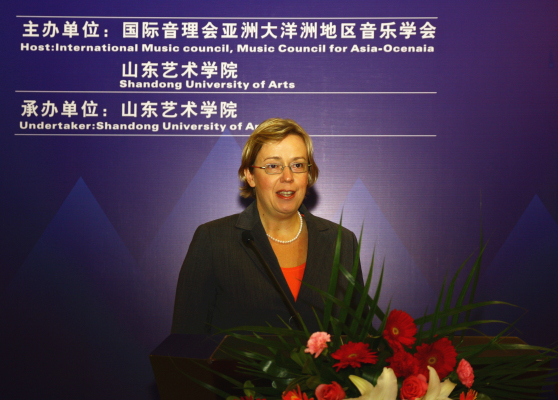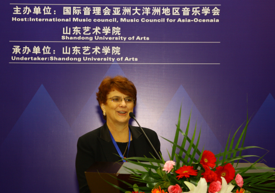 国际音理会亚洲大洋洲地区音乐学会会长Helen Lancaster(海伦?兰卡斯特)致词。Helen Lancaster会长认为,今天这个场合意义非凡,是亚太民族音乐学会第十七届年会,同来自于亚太地区有着不同音乐文化背景的音乐家们相聚在这里,形成了一个多元化的交流平台。同时,对于个人来说,这也是个非常特殊的场合,因为山东艺术学院已与其母校昆士兰音乐学院签订了交换协议。她说,亚太民族音乐学会不仅是世界上此领域成立时间最久的组织,并且是最具影响力的组织之一。她期待在未来的会议期间,能够听到许多鼓舞人心的演讲,达成一些激动人心的合作,并相信大家长久持续建立的友谊将会帮助那些新兴的年轻音乐组织成长壮大。