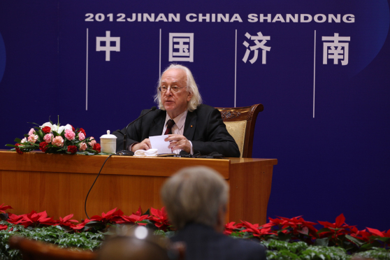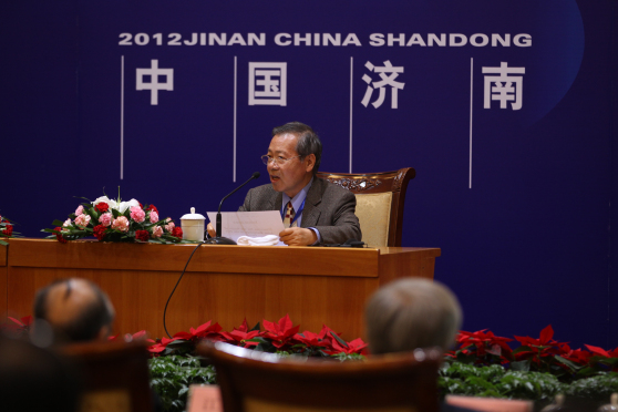 亚太民族音乐学会会长王耀华致词。致词中,王耀华会长代表亚太民族音乐学会全体理事对为本次会议筹备工作作出巨大贡献的山东艺术学院领导、师生和全体工作人员致以深挚谢忱,并简要介绍了亚太民族音乐学会成立以来的工作情况和为推动相关领域学术研究事业的发展所起的重要促进作用,介绍了本次学术研讨会的议题。王耀华会长指出,“艺术无国界,探索无止境”。本次会议的召开,对于促进亚太地区传统音乐学的学习、交流、研究与实践,更加广泛地传播世界先进文化,促进人类文明的繁荣与发展,都具有深远的历史意义和重大的现实意义,并相信,各位专家深入的交流与探讨,将会带来更多新观念和新思路,结出更加丰硕的学术研究新成果。