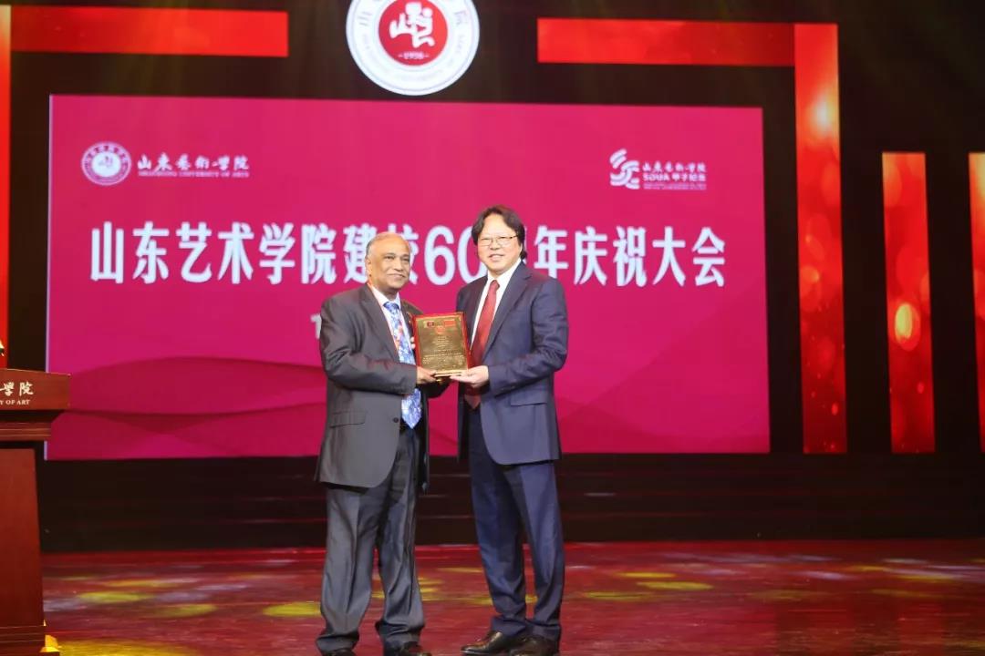 斯里兰卡斯中友好协会主席阿贝塞克拉、港澳台美术家协会主席蔡豪杰分别向山东艺术学院赠送匾牌和书画作品,王力克接受赠送。