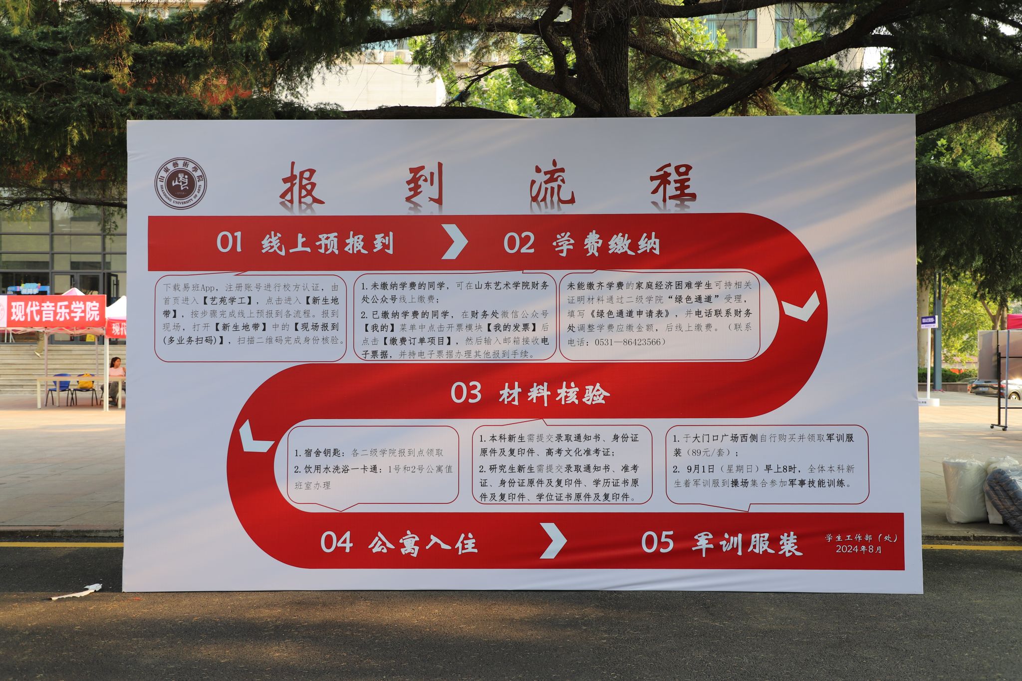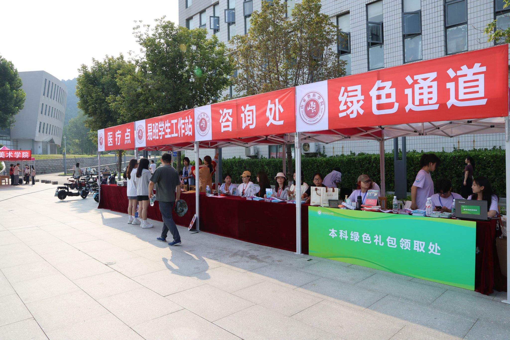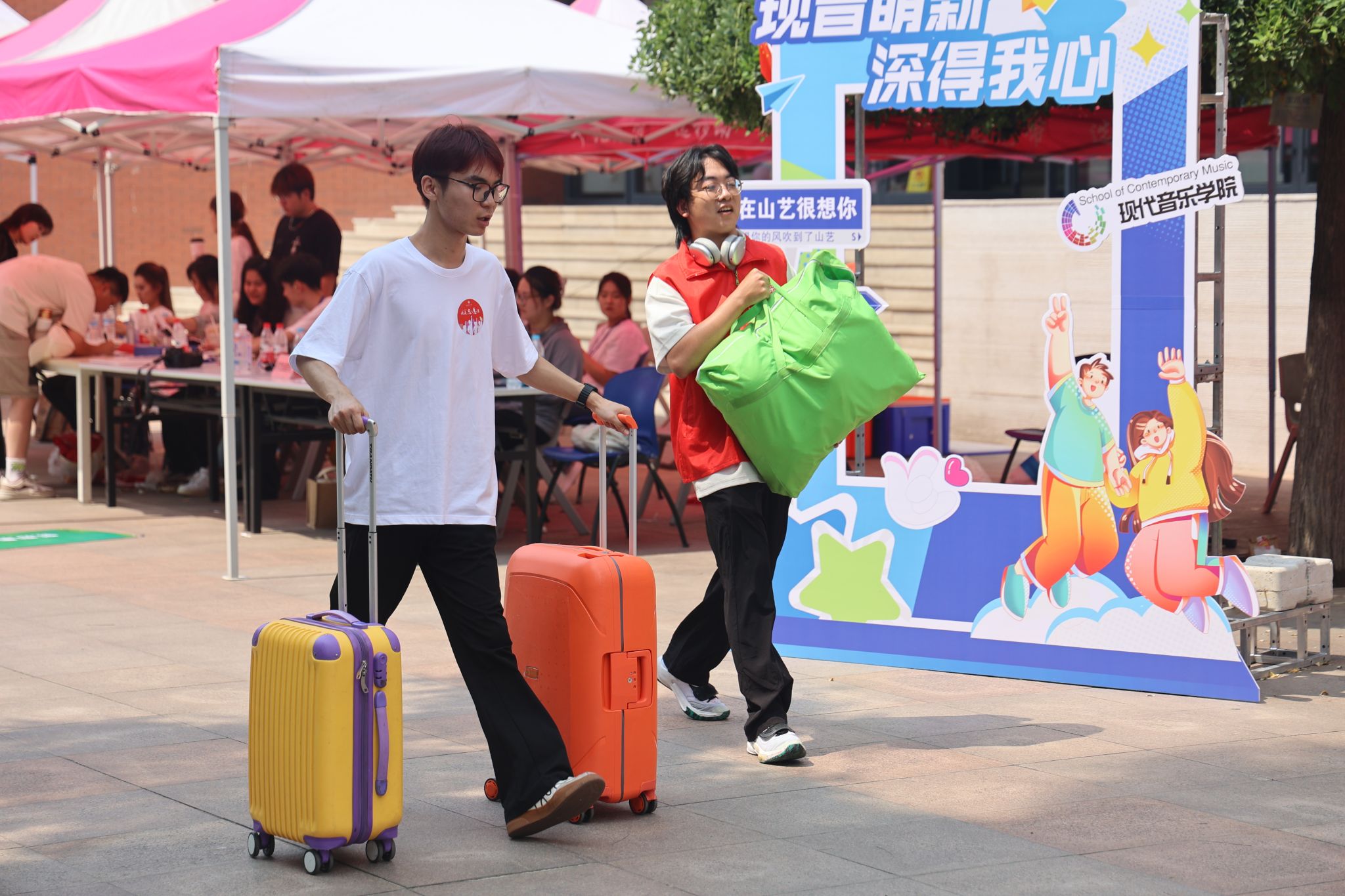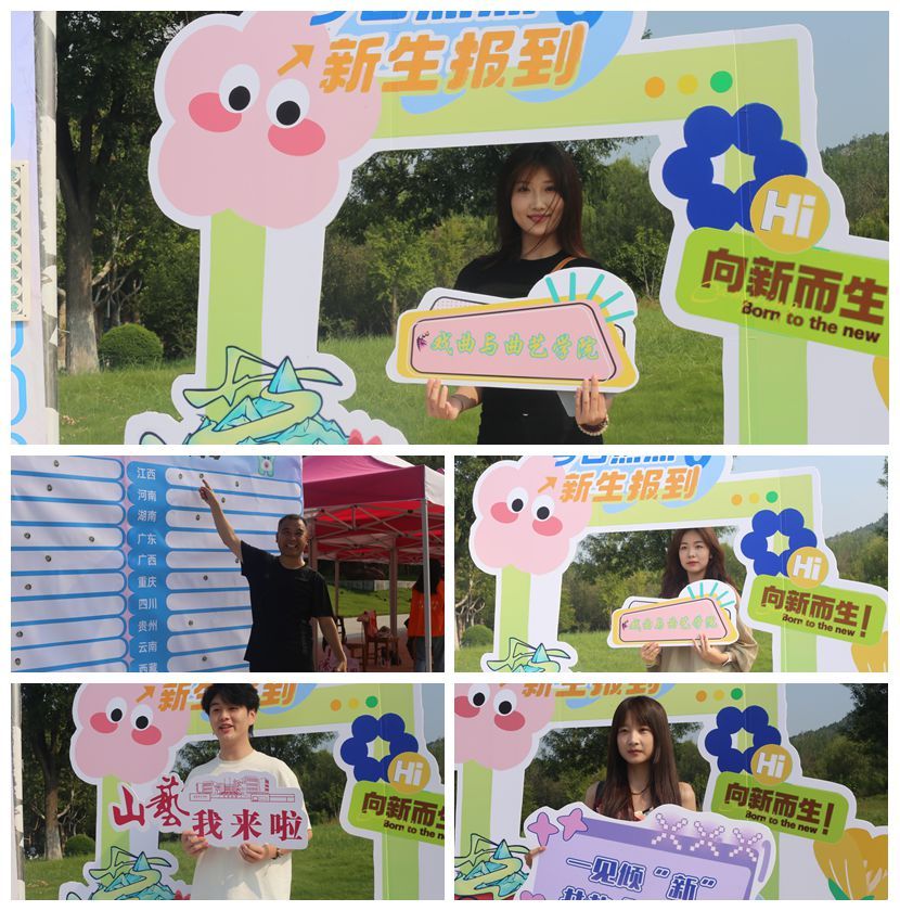 各学院报到点热闹非凡,结合专业特色精心准备了别出“新”裁的迎新活动,让新生们在轻松的氛围中感受校园文化,在欢声笑语中融入山艺大家庭。音乐学院和现代音乐学院在文东校区广场上奏起悠扬的旋律,老生与新生共同演绎精彩乐章;美术学院、设计学院均设置特色打卡点,为新生和家长们定格下灿烂笑容,见证成为山艺人的第一天;戏剧学院在学院门口种下“心愿树”,同学们亲手将花朵开满枝头;舞蹈学院为萌新们准备了才艺展示转盘,学生们穿戴着少数民族服装服饰翩翩起舞,尽展专业风采;戏曲与曲艺学院学长学姐们现场展示快板、水袖等专业特长,同时准备了迎新展板,邀请新生们共同绘制戏曲脸谱;书法学院为新生准备了传统扇面,萌新们纷纷用毛笔写下开学寄语;传媒学院为当天生日的新生准备了蛋糕和小礼物;艺术管理学院、电影学院、城市艺术与创意学院、国际艺术交流学院纷纷开展砸金蛋、幸运抽奖等活动,为报到新生带来神秘惊喜。