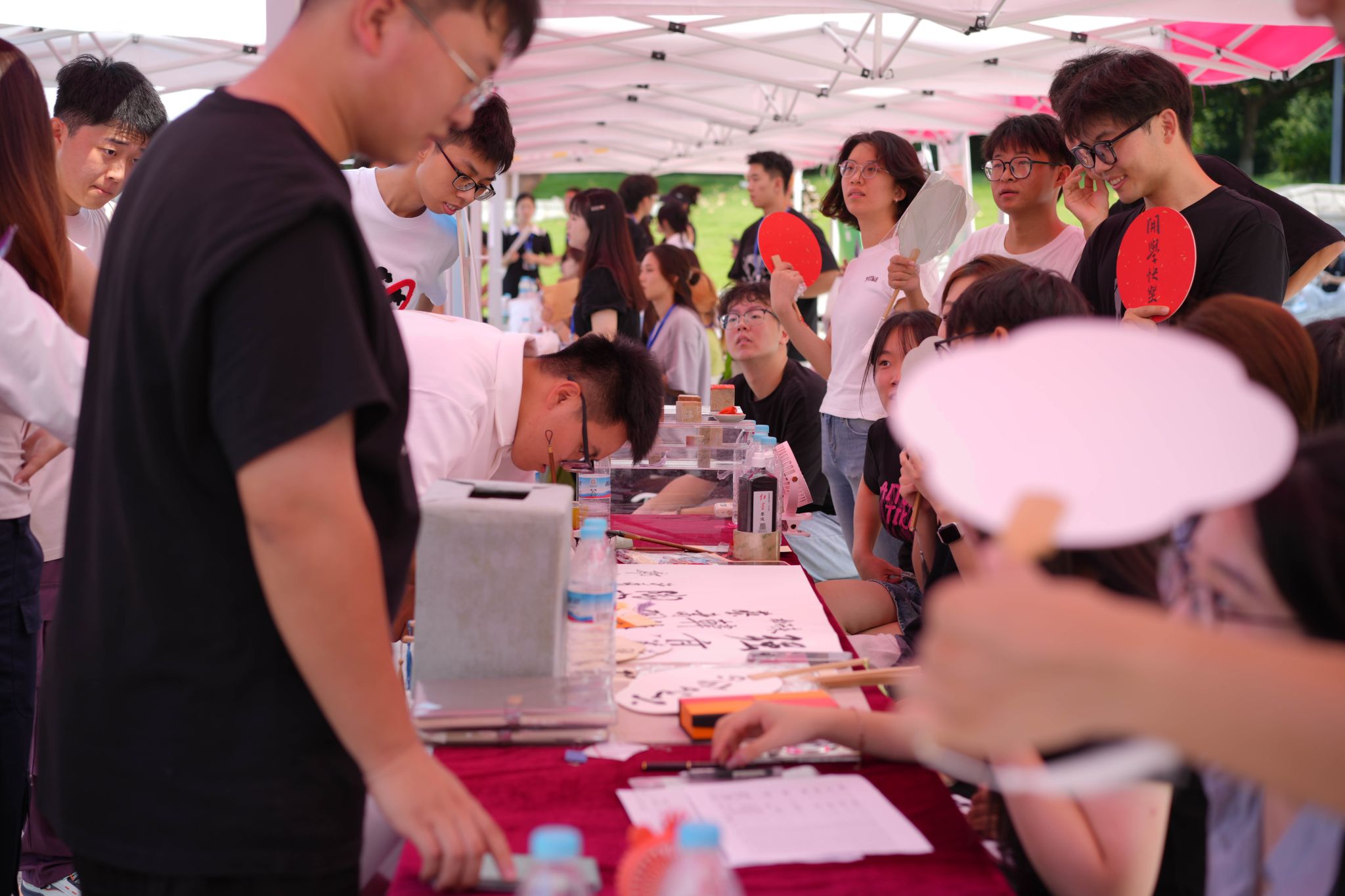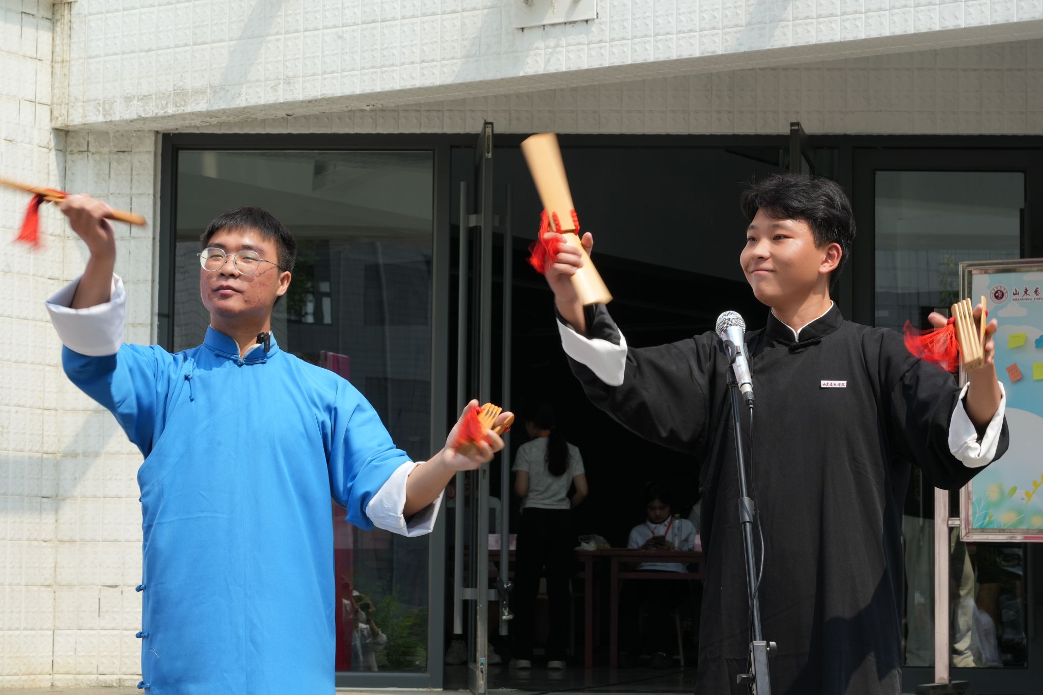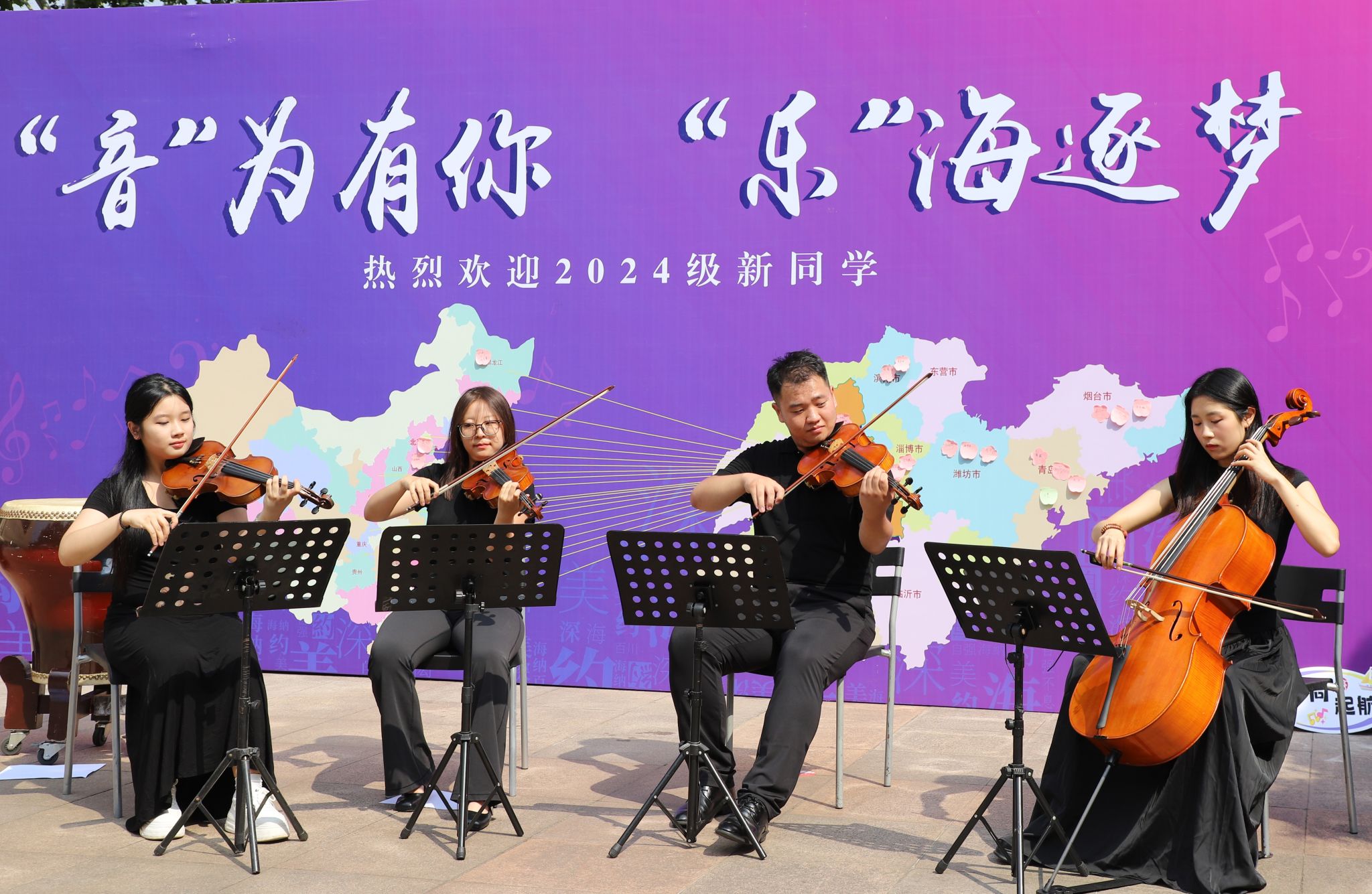 各学院报到点热闹非凡,结合专业特色精心准备了别出“新”裁的迎新活动,让新生们在轻松的氛围中感受校园文化,在欢声笑语中融入山艺大家庭。音乐学院和现代音乐学院在文东校区广场上奏起悠扬的旋律,老生与新生共同演绎精彩乐章;美术学院、设计学院均设置特色打卡点,为新生和家长们定格下灿烂笑容,见证成为山艺人的第一天;戏剧学院在学院门口种下“心愿树”,同学们亲手将花朵开满枝头;舞蹈学院为萌新们准备了才艺展示转盘,学生们穿戴着少数民族服装服饰翩翩起舞,尽展专业风采;戏曲与曲艺学院学长学姐们现场展示快板、水袖等专业特长,同时准备了迎新展板,邀请新生们共同绘制戏曲脸谱;书法学院为新生准备了传统扇面,萌新们纷纷用毛笔写下开学寄语;传媒学院为当天生日的新生准备了蛋糕和小礼物;艺术管理学院、电影学院、城市艺术与创意学院、国际艺术交流学院纷纷开展砸金蛋、幸运抽奖等活动,为报到新生带来神秘惊喜。