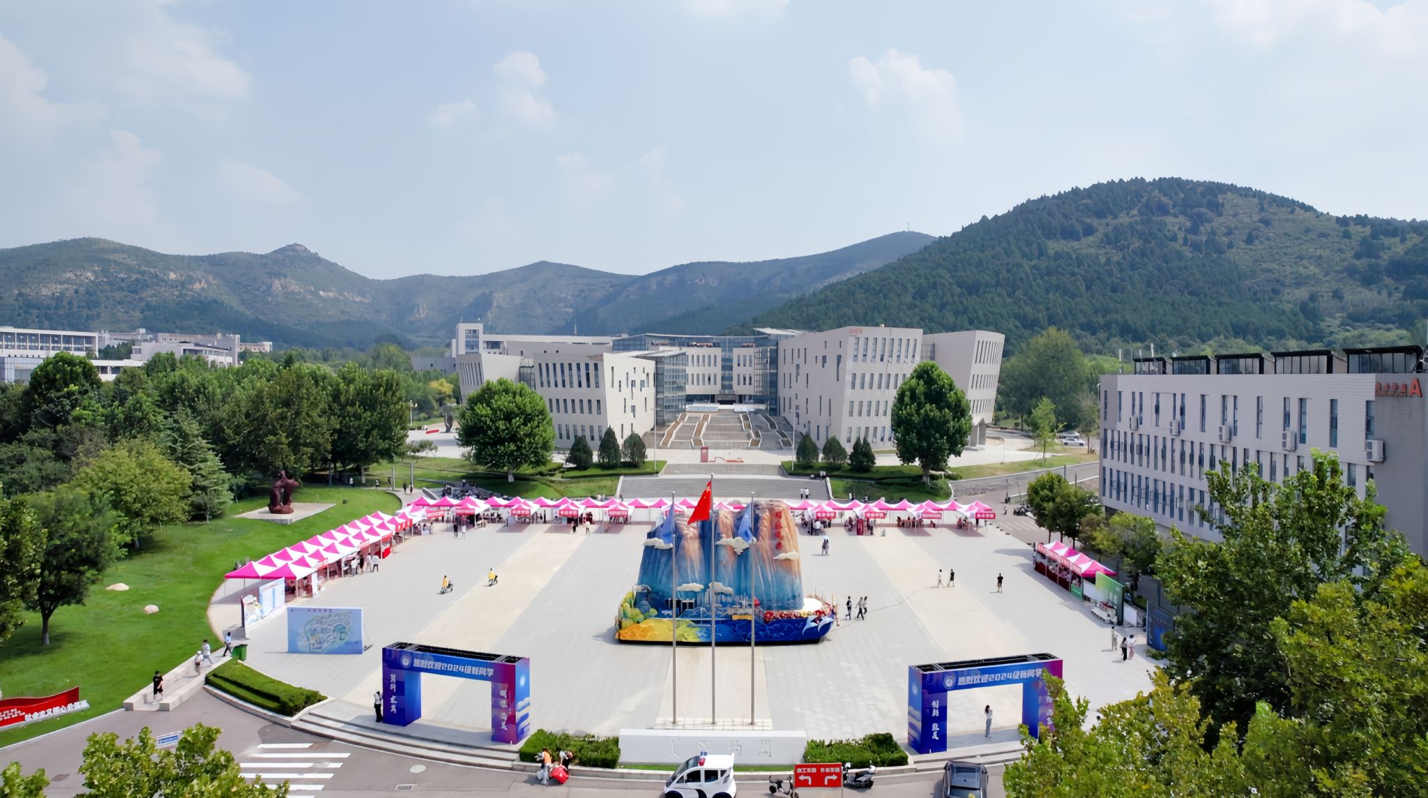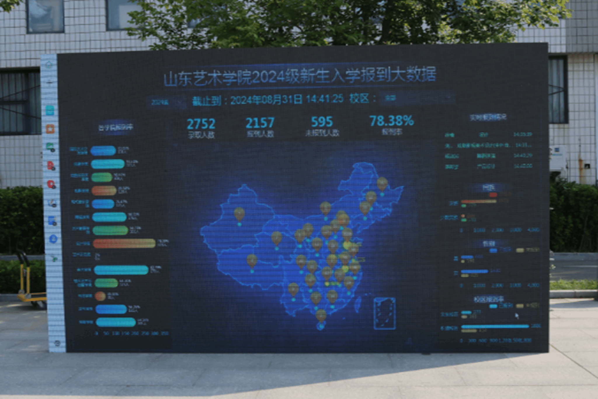 校园内横幅高挂,彩旗飘扬,校友广场上铺开几十顶鲜艳的帐篷,林荫道旁、楼宇前摆满了特色迎新展板、标语……处处洋溢着热情温馨、生机勃勃的校园氛围。现场LED大屏实时展示全校新生报到情况和信息,可视化助力迎新工作有序开展。
