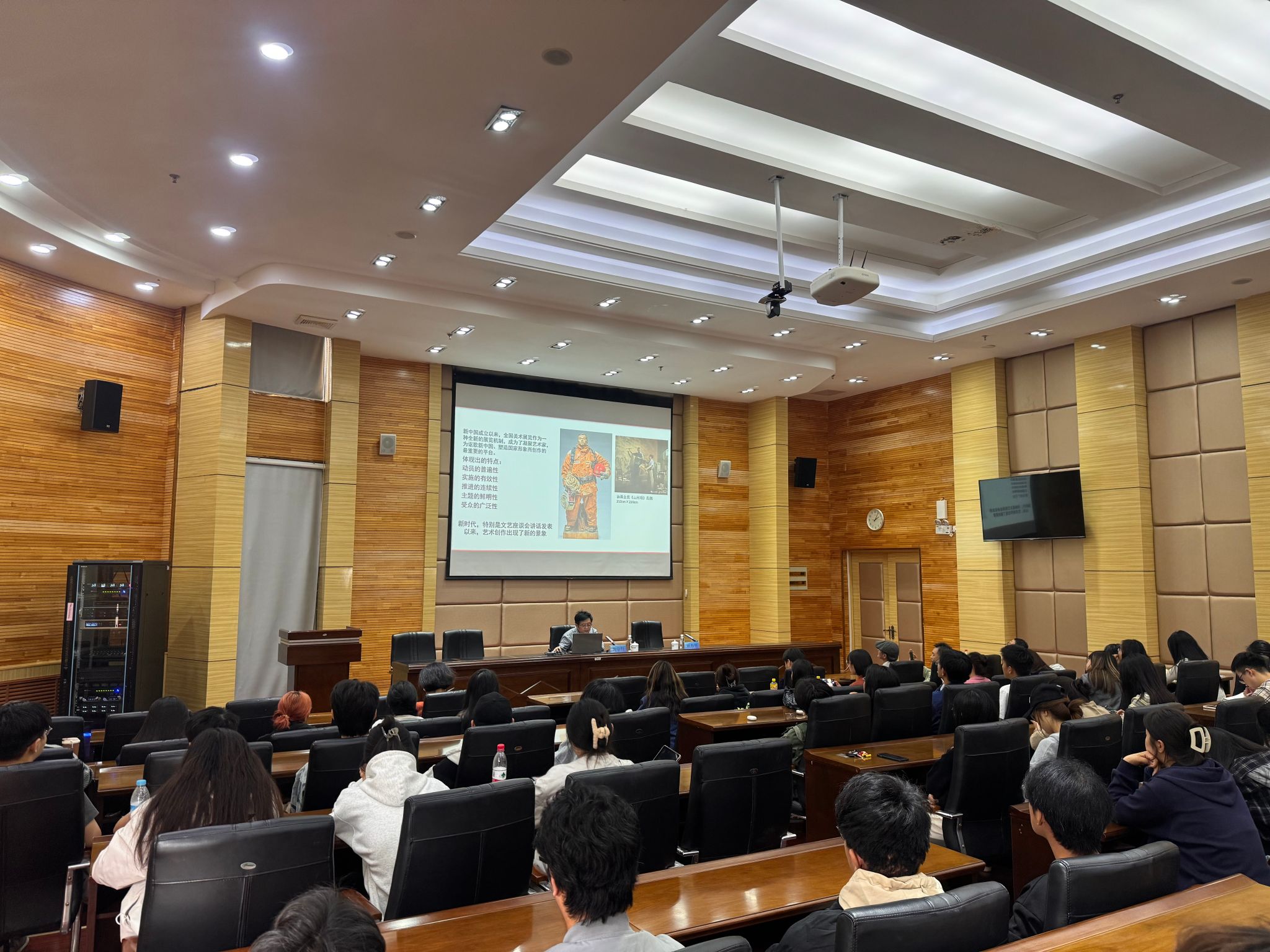 黄宗贤以第十四届全国美展入选作品的特点为切入点,从唱响主旋律、力求多样性,视向下沉、底层叙事,时代意象、多维呈现,跨界中融合、互动中拓展,艺术空间转向、强化公共价值等五个方面,对当代美术创作的主题、题材、技法、表现方式等进行了深入浅出的讲述,并对近年来美术创作中出现的问题进行了反思。黄宗贤以其深厚的学术造诣和丰富的实践经验,为我校师生带来了一场思想的盛宴,对今后的艺术学习与创作带来帮助和提升。