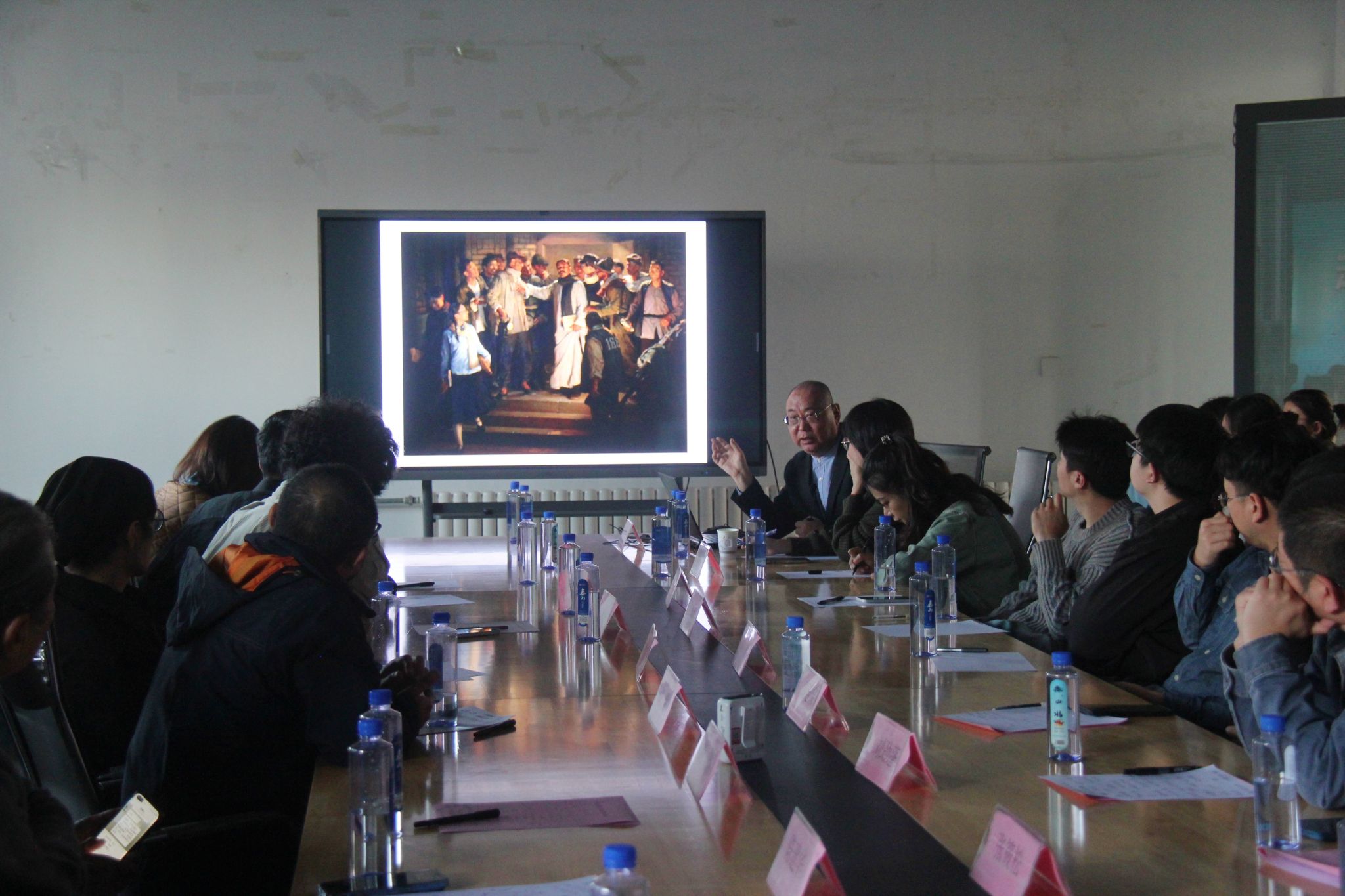 在“时代背景下的美术创作学术论坛”上,围绕第十四届全国美展金奖作品《工人是“天”》,李前以《我怎样画油画<工人是“天”>》为题,从题材的选择、构图的推进、画面的制作等方面进行创作回顾分享,讲述了他如何从李大钊先生早期革命活动的历史背景中找到绘画的主题思想“工人是天”,通过《工人是“天”》的草图演进展示,说明环境与人物造型的关系、作为画家对于历史事件的“观看”角度以及对于画面人物造型动机的出现和确立的思考逻辑等,强调美术院校设置透视、解剖、色彩学三门基础类主课的重要性。李前还与美术学院师生就当下中国美术创作进行了深入的研讨交流。