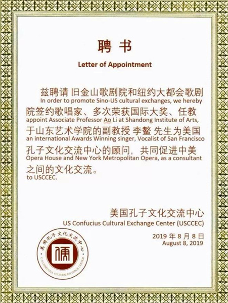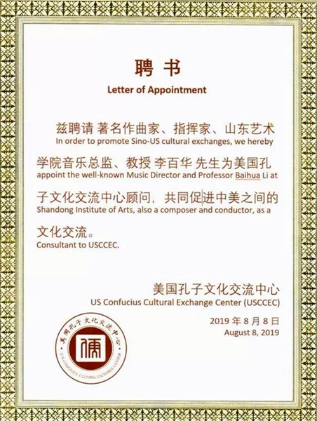 近日,为促进中美文化交流,美国孔子文化交流中心聘任作曲家、指挥家、山东艺术学院艺术实践与创作处李百华教授,男低中音歌唱家、旧金山歌剧院和纽约大都会歌剧院签约演员、山东艺术学院音乐学院李鳌副教授,山东艺术学院杰出校友、作曲家、上海音乐学院音乐工程系主任于阳教授等5人为美国孔子文化交流中心顾问。