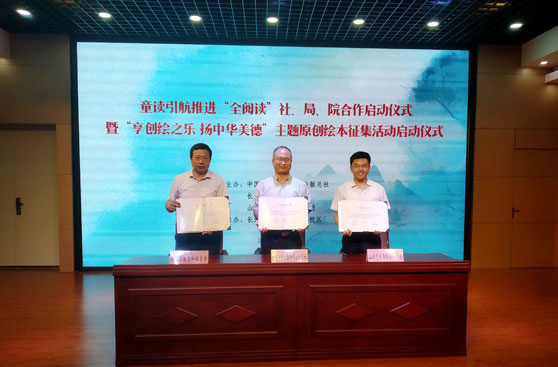 仪式上,孔宪坤、中国少年儿童新闻出版总社常务副社长(正局级)郝向宏、长清区副区长周波致辞。设计学院和长清区教育体育局、中国少年儿童新闻出版总社就童读引航推进“全阅读”社、局、院合作暨“享创绘之乐 扬中华美德”主题原创绘本征集活动签订合作意向书。