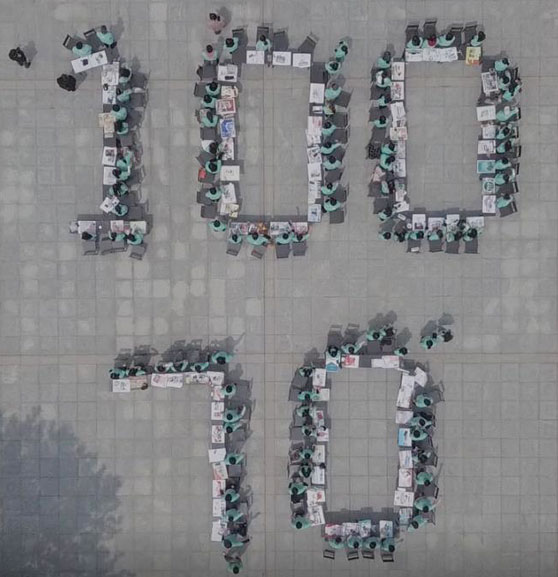 活动现场由巨大的“70”“100”构成,寓意为庆祝新中国成立70周年、五四运动100周年。活动选取了五四运动至今百年历史上的100个重大事件,由100名团员手绘完成。其中既有五四运动爆发的瞬间,也有新中国成立开国大典上激动人心的场景,更有新时代“C919”国产大飞机首飞成功、港珠澳大桥建成通车的画面。团员青年用手中的画笔描绘祖国沧桑历史,感受历史巨变,爱国主义情感油然而生。设计学院2017级环境艺术专业周文杰说:“本次主题团日既是对历史的回顾与致敬,也是对新时代的赞美与讴歌,更是对未来的擘画与展望。作为新时代的山艺新青年,我们一定继承和发扬五四精神,把爱国情、强国志、报国行自觉融入到实现中华民族伟大复兴的奋斗之中。”