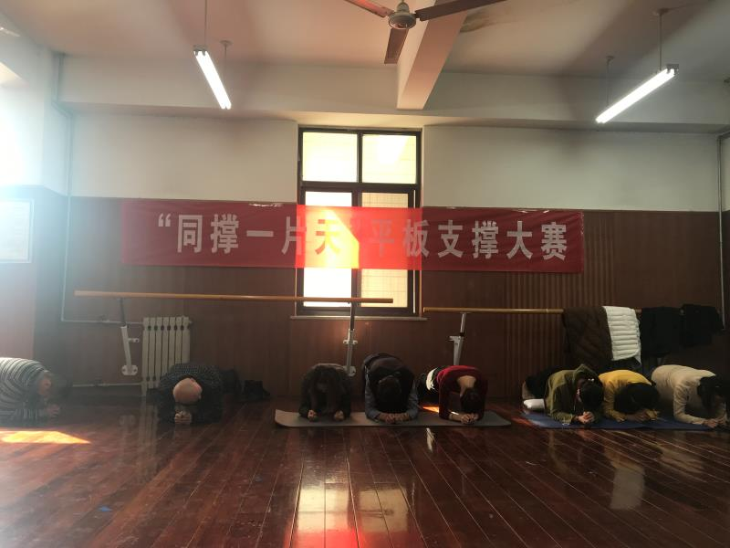 舞蹈学院工会组织男女教职员工开展了“同撑一片天”平板支撑大赛。比赛中,教职员工用双肘撑地,身体重心不能接触地面,他们竭尽全力,尽管有的职工已经体力不支,但是仍咬牙坚持。活动增强了教职员工的身体素质,激发了大家的节日热情,展现了我校教职员工不轻言放弃的精神面貌。