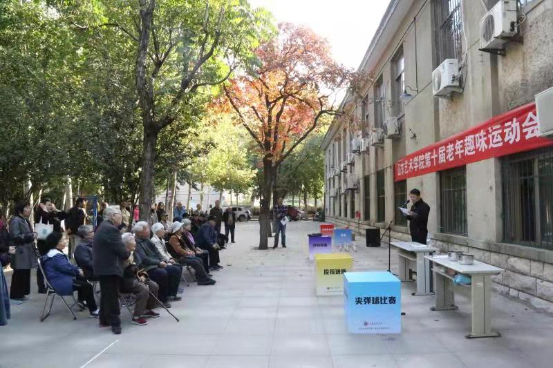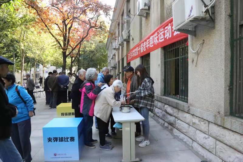 运动会突出了“趣味”的特点,取消了田径项目,增添了“投筷子入瓶”“筷子夹弹球”等有趣、健身又健脑的比赛项目,深受老同志们的欢迎。参加老年趣味运动会的有年过九旬的长者,也有60多岁的“年轻”运动员,他们踏着《运动员进行曲》的轻快节奏,来到文东校区小广场上,脸上洋溢着喜庆祥和的笑容,互相握手致意。老同志们本着身体第一、友谊第二、比赛第三的原则,以饱满的热情、平和的心态,赛出了友谊、赛出了风格、赛出了水平,尽情享受到了比赛的乐趣,感受到了运动的魅力,把本届运动会开成了团结、热烈、文明、安全、康乐的体育盛会。运动会上,大学生志愿者给予了热情周到的服务。