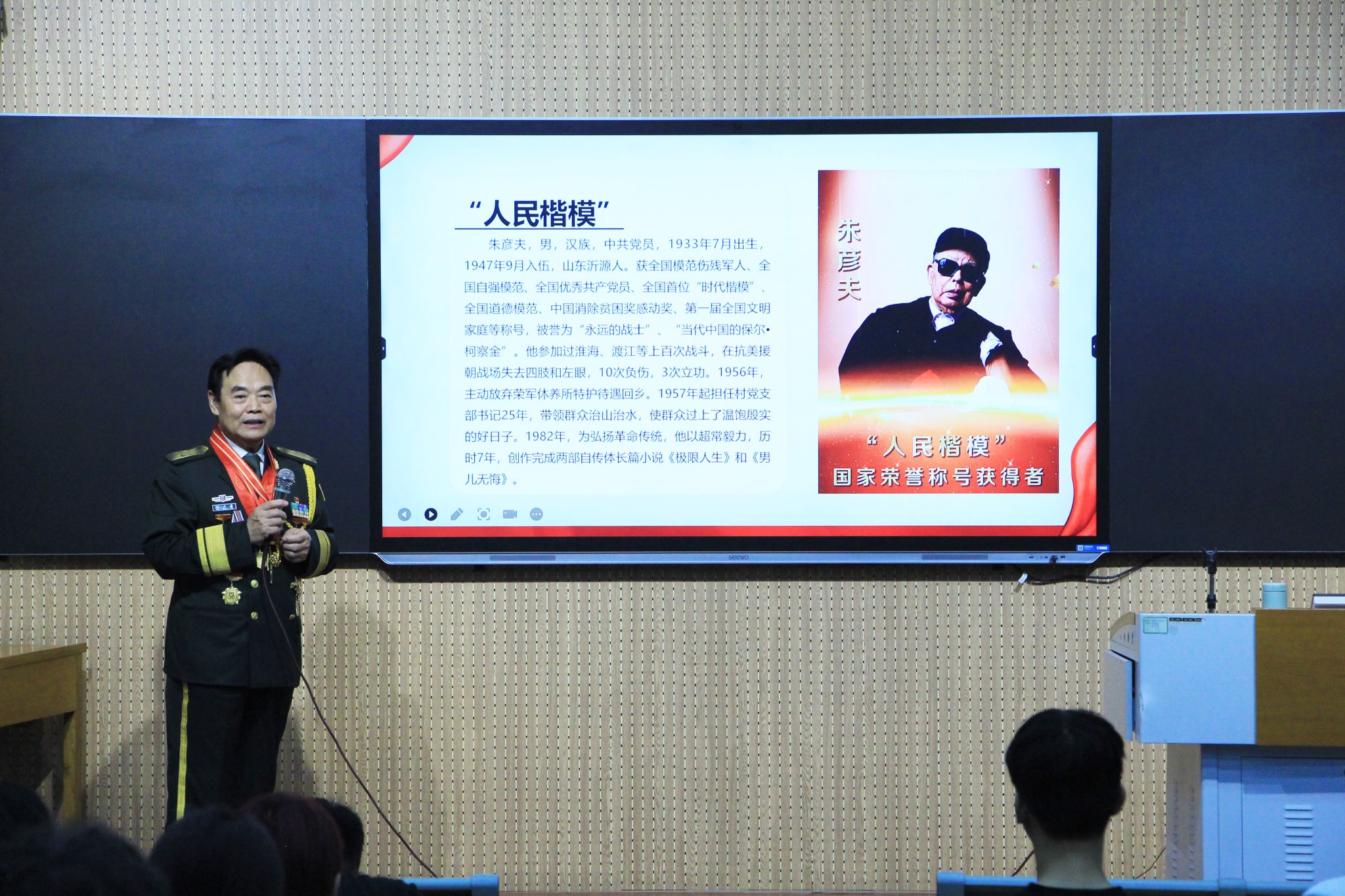 刘永海以《传承红色基因,争当时代新人》为主题,讲述自己从军报国、服务社区、不断奉献的人生经历,特别是“中国的保尔·柯察金”“人民楷模”朱彦夫的故事,围绕枪杆子、锄杆子、笔杆子三个方面,还原了朱彦夫“军人脊梁永不弯”的铁血意志、用假肢丈量张家泉村土地带领村民致富的奋斗史和口衔笔杆创作的精神信仰,为2025级新生上了一堂生动的爱国主义教育课。随后,刘永海与新生展开跨代际交流,通过展示“老兵的军功章”“社区的民情日记”等实物,让家国情怀具象化。当看到、听到那一件件鲜活的事迹和实物时,同学们深受触动,深刻感悟到如今幸福的来之不易,并决心奋发图强,努力学好专业知识,用艺术服务社会、报效祖国。