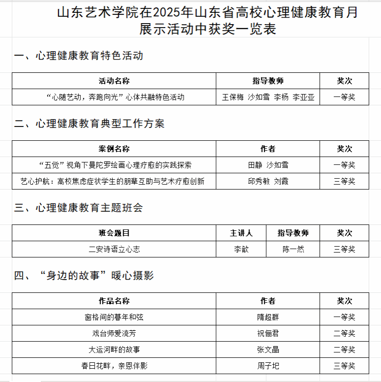 近日,2025年山东省高校心理健康教育月展示活动评选结果公布。我校师生在心理健康教育特色活动、优秀典型工作方案、优秀心理健康教育主题班会、“身边的故事”暖心摄影等类别中荣获一等奖3项、二等奖2项、三等奖3项。