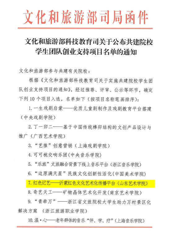 “共建院校学生团队创业支持项目”是国家文化和旅游部为进一步支持共建院校对接行业产业优质资源,搭建协同创新育人平台,早发现、早培养文化艺术领域具有“双创”潜力的好苗子而推出的。支持项目面向文旅部共建高校有正式学籍的非毕业年级在校学生、以团队为单位申报,要求申报项目具备一定基础,能紧密结合文化艺术和旅游领域新发展、新业态、新技术、新应用,具有良好的社会效益、明确行业产业合作意向和市场转化预期。本次评选全国共有10个项目入围,我校获批立项的“红色记艺——沂蒙红色文化艺术化传播平台”是基于传播与传承沂蒙红色文化而打造的集文化传播、展示、分享、服务于一体的平台,“讲红色故事”“做红色研究”“搞红色创作”“做红色服务”“传红色精神”,通过聚集红色信息资料,助力红色研究和艺术创作,使红色艺术服务公众,促进红色精神的代代传承。该项目曾获第十二届“挑战杯”山东省大学生创业计划竞赛金奖。