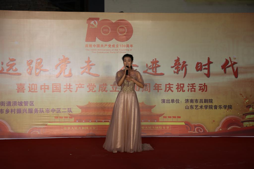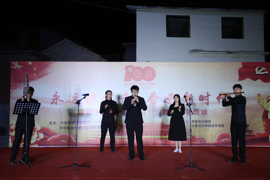 6月19日,为献礼党的百年华诞,扎实推进党史学习教育,“泉城义工”大学生艺术团走进兴隆街道专场演出暨庆祝中国共产党成立100周年主题音乐会在济南市市中区兴隆街道涝坡管区矿村举行。音乐会由我校音乐学院、济南市乡村振兴服务队市中区二队、济南市兴隆街道涝坡管区主办,济南市乡村振兴服务队市中区二队队长、共青团济南市委副书记孟云霞,我校音乐学院相关负责人和兴隆街道村民观看音乐会。