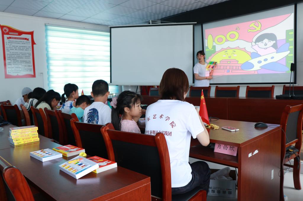 在当地乡村小学,实践团成员把美术用品和亲手绘制的89张书签送到孩子们手中,并根据当地艺术资源匮乏、孩子年龄小、艺术基础薄弱等特点,精心准备了趣味美术课和音乐课。他们充分发挥美术学院的专业优势,结合乡村实情,以建党百年为主题,经过数十小时的努力,绘制出“庆祝建党百年”“党史学习教育”等主题的墙绘作品,进一步丰富了乡村的精神文化生活。