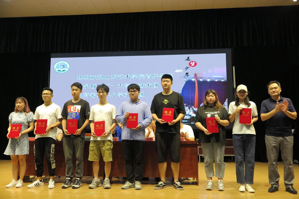 仪式上,聂立家和孙常青分别致辞。孙常青为“泉城义工”大学生艺术团的各位同学颁发支教聘书。