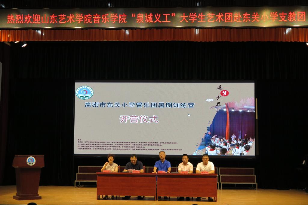 7月13日,音乐学院“泉城义工”大学生艺术团赴高密市东关小学开展为期3周的支教活动。高密市东关小学举行了管乐团暑期训练营开营仪式,中国音乐家协会会员、山东省音协管乐专业委员会会长、山东艺术学院教务处原处长聂立家教授,东关小学校长孙常青,山东艺术学院音乐学院相关负责人,管乐团学员及家长参加开营仪式。