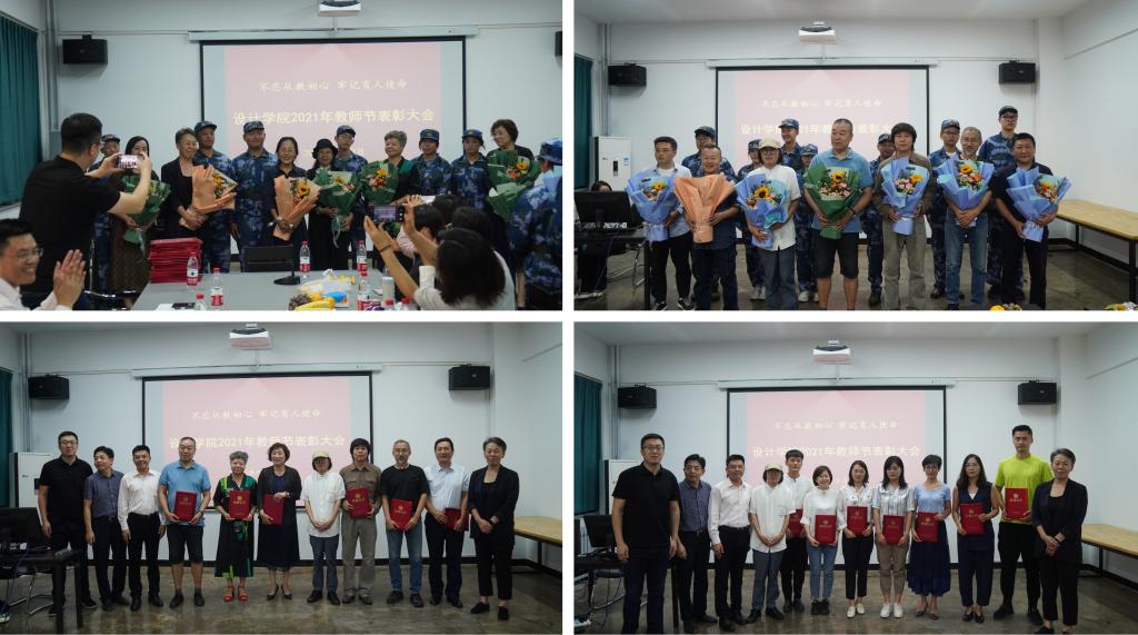 9月9日,设计学院在会议室举办茶话会,新老教师欢聚一堂,畅聊从教初心,分享经验感受。随后,在设计学院庆祝第37个教师节表彰会上,全体教职工一起学习了习近平总书记关于教育工作的重要论述和对广大教师提出的殷切期望,观看MV短片《百年大先生》。校党委委员、统战部部长兼设计学院院长荆雷及学院领导班子为30周年老教师代表颁发了荣誉证书,为8位原系主任颁发了突出贡献奖,并为获得设计学院首届“教工之星”的9位教师颁发了荣誉证书,感谢他们为设计学院事业发展作出的贡献,2021级新生给从教30年以上的老教师代表献上鲜花,并送上祝福。