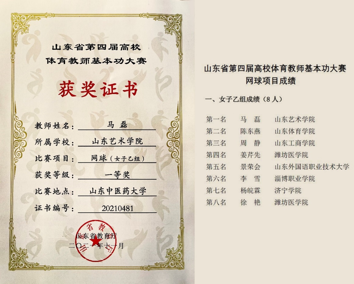 近日,山东省教育厅下发《关于山东省第四届高校体育教师基本功大赛获奖情况的通报》,我校公共教育学院选派的马磊副教授荣获大赛网球项目(女子乙组)一等奖第一名。
