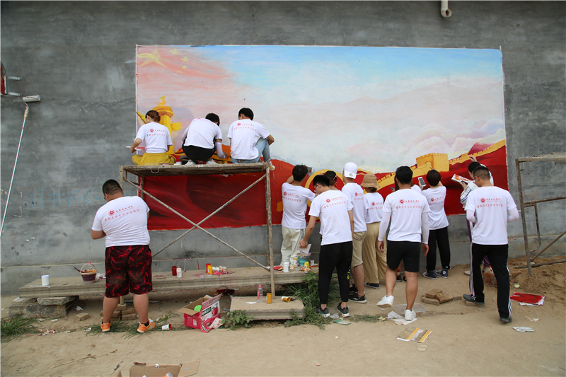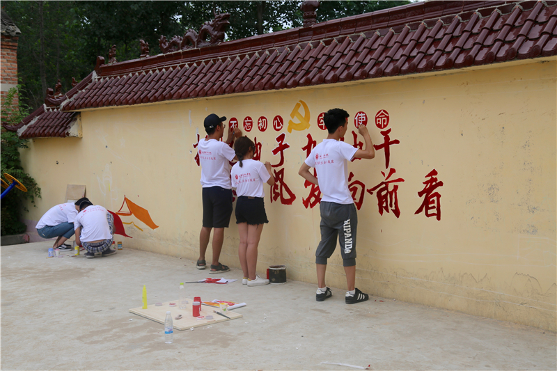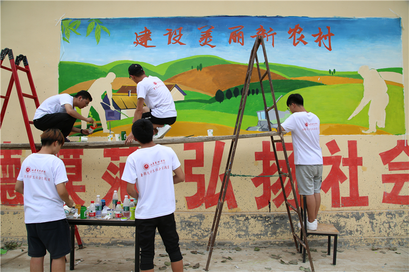 艺术支教的同学教的开心,手绘美丽乡村实践团成员画的卖力。33名手绘美丽乡村的实践团成员分为3个组,分赴黄河滩区第一书记村刘口、岔河头、左庄,在总长度100多米的墙面上构思起一幅幅美丽乡村的图景,用手中的画笔、瓶里的颜料尽情讴歌与描绘着改革开放四十年来乡村的沧桑变化。从准备画材到分组测量和勾线,从打底色到涂颜料,手绘美丽乡村的山艺大学生把每一面墙体都当成了艺术品去雕琢,大家就调色、构图进行热烈的讨论,精益求精。经过同学们的精心设计、潜心创作,以丙烯、水彩为绘画材料,以“建设美丽新农村”、“撸起袖子加油干,意气风发向前看”为内容,鲜艳的国旗、庄严的华表和国徽、美丽新农村的图景让一面面墙体生动起来。看着一面面光秃秃的墙体“脱胎换骨”,手绘美丽乡村实践团成员美术学院刘云骄傲地说“习近平总书记说青年人要爱国、要励志、要求真、要力行,艺术要为人民服务,省委书记刘家义调研山艺时提出要为黄河滩区做些工作,作为一名新时代的山艺学子,我愿用实际行动践行习近平总书记的教导,坚定理想信念、学习专业知识、积极参与实践,为乡村振兴做点力所能及的事情。”