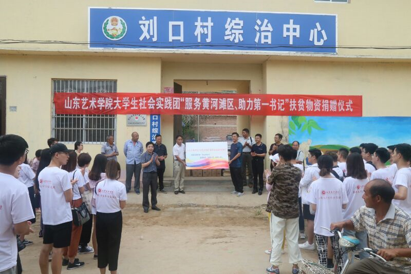 除了艺术下乡支教和手绘美丽乡村外,山东艺术学院大学生社会实践团还积极联络校内外资源,协调济南汇丰中天电子科技有限公司、济南鲁晶半导体有限公司提供了2000只价值20000余元的扶贫节能灯,捐赠给第一书记村建档立卡贫困户。筹集了100套支教画材、200余套支教书籍,发放给建档立卡贫困户子女和特困留守儿童。7月9日上午,在菏泽市牡丹区李村镇刘口村举办了山东艺术学院大学生社会实践团“服务黄河滩区、助力第一书记”扶贫物资捐赠仪式。第一书记帮包村岔河头村主任张书堂和左庄村村主任张书进从实践团带队老师手中接过捐赠的物资清单,用朴实的乡音连声激动地说“感谢山东艺术学院,感谢社会实践团的大学生,感谢第一书记,你们来了,我们的日子才越过越好了……”