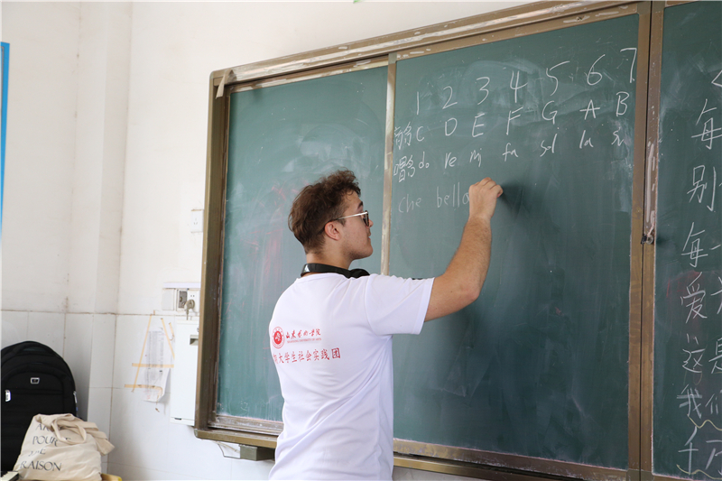 “我叫尼古拉,来自万里之外的德国……”教室里,一位手持小号、金发碧眼的青年正用略显生硬的汉语自我介绍。尼古拉是山东艺术学院大学生暑期社会实践艺术支教团的成员,获悉校团委组织赴黄河滩区第一书记村艺术支教的消息后,尼古拉便通过国际交流合作处联系到校团委,第一时间加入了大学生艺术支教团。在30多度高温的教室里,满头大汗的尼古拉和另外5名小伙伴正投入地为50多位黄河滩区的小学生普及音乐基本知识,教他们唱简单的歌曲。教到兴起时,尼古拉还即兴演奏起他心爱的小号,悦耳的音乐传出了教室,伴着孩子们的掌声、伴着满满的爱心在左庄村的上空久久回荡。山艺大学生教的认真,黄河滩区第一书记村的孩子们学的投入。从“do re mi fa so la si”开始的韵律到歌曲《最好的未来》的学习演唱,孩子们学的有模有样,那一双双渴望的眼神和一个个稚嫩的声音让趴在窗台上围观的家长眼含激动的泪水,也深深触动着每一位实践团成员的内心。教完了音乐教绘画,艺术支教团的大学生使出了浑身解数,听着他们童真的歌声、看着妙趣横生的涂鸦,山艺大学生暑期社会实践团的同学们在汗流浃背中体会到了一种被需要的喜悦。负责美术教学的支教团成员设计学院学生张雅洁说“扶贫先扶智,治贫先治愚。校团委组织我们开展这次艺术教育进乡村社会实践,既是我们了解社会、助力精准扶贫的行动,也是我们奉献自己、展示新时代山艺大学生风采的机会,我觉得不虚此行、收获很大!”。