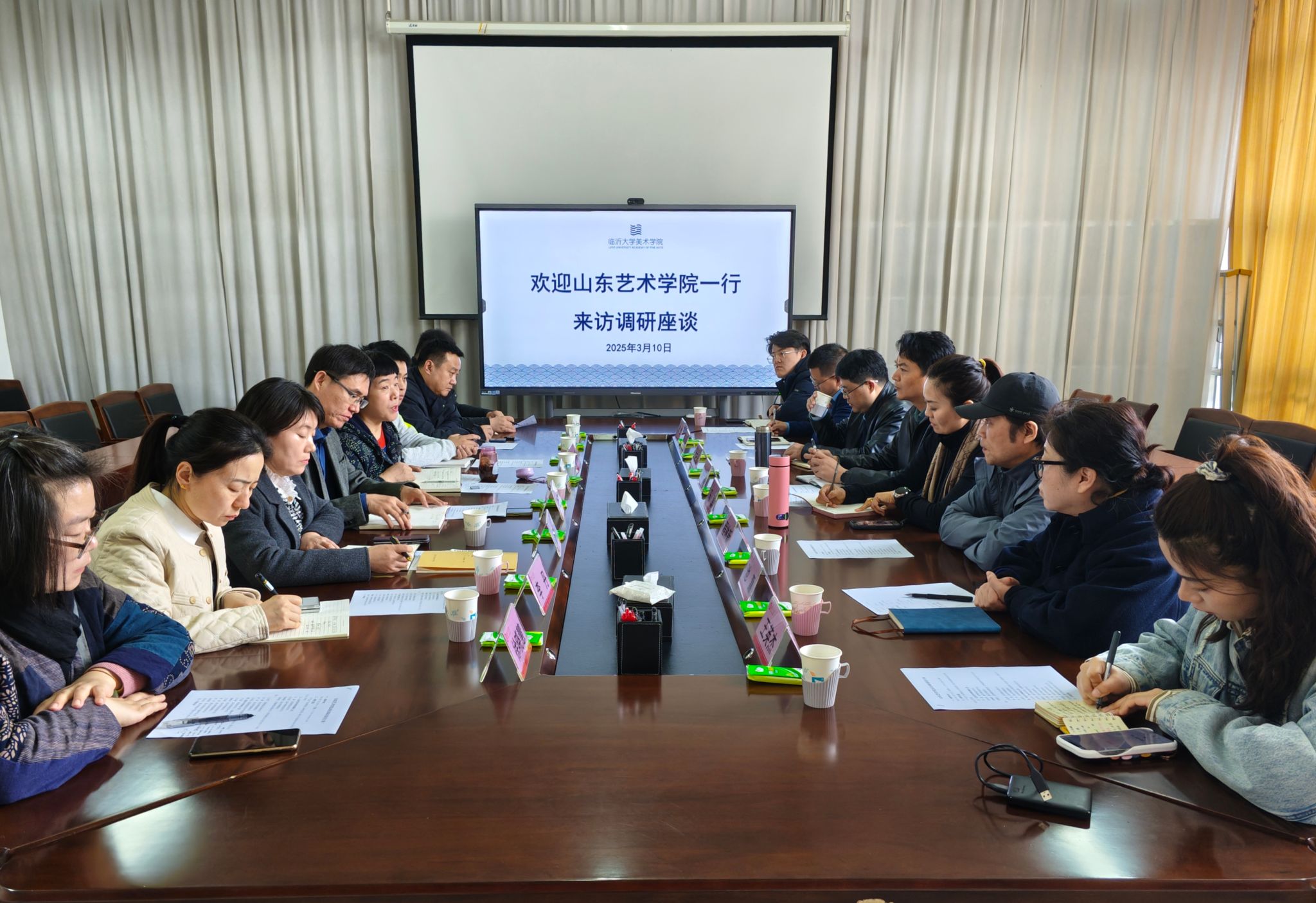 在临沂大学,临沂大学发展规划处负责人以“数读临大”的方式重点介绍了在校园建设、招生就业、教学科研及社会服务等方面的基本情况。双方就“十五五”发展规划、合作发展、学科建设、人才引进、美术专业社会服务与创收、校友工作等内容进行座谈交流。双方表示,将建立常态化交流机制,在高质量社会服务等方面进一步加强合作。学校一行人参观了临沂大学美术学院非遗“两创”研究中心等场所。