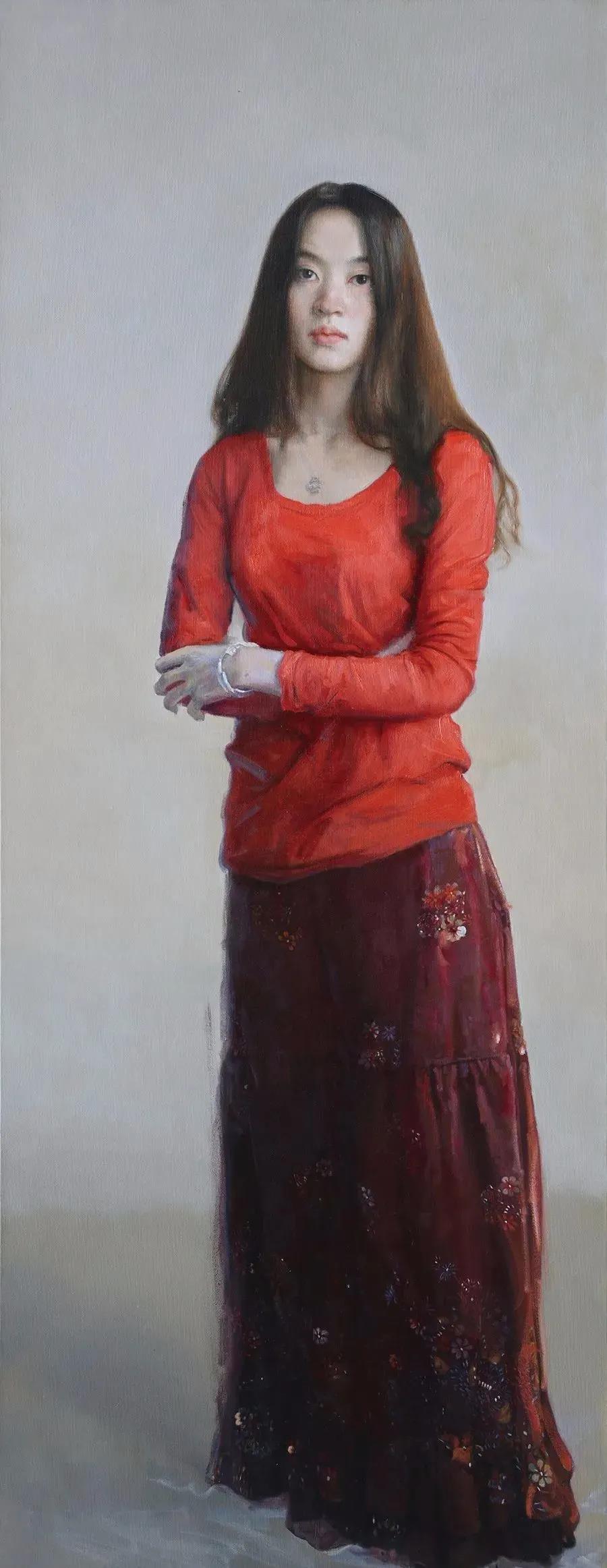 王少伦《穿红衣的女子》布面油画 200cm×75cm 2021年